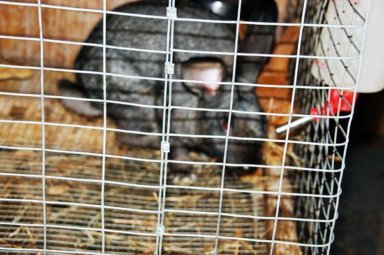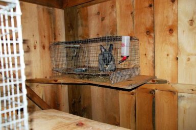 We worked on the bunny cage for the two males this morning and had to make a couple of thunder runs to the Agway store for a water bottle, wire clips some chicken maintainer feed and a salt ring. We also bought a door spring for the outside run door, so it would pull shut when you go in with your hands full. You can then easily hook the latch. Before, you needed one hand to hold the door shut and another to hook the latch. Upon putting the two “Buck” rabbits into the new cage, which allowed the female, Fuzzy, to tend her young and Gracie, to get ready to deliver, we were surprised to find George mounting Wuzzy………uh-oh, perhaps Wuzzy wasn't really wuzzy was he? I mean, maybe we didn’t see what we thought we saw at the bunny lady's place in Earlton!!!! I’m sure if this little boy impersonator wasn’t pregnant before, she will be pulling fur in four weeks. We just gave up and got the chicken crate out and put the “real Buck, George ” in it and let the “Wuzzy lady” stay in the new crate. Vick went back to Agway again to get another water bottle, feed pan and salt ring. Now we might as well make another crate pen for the buck so we can have our chicken crate back and then make another community crate for the juvenile bunnies when they are big enough to leave their mommy.